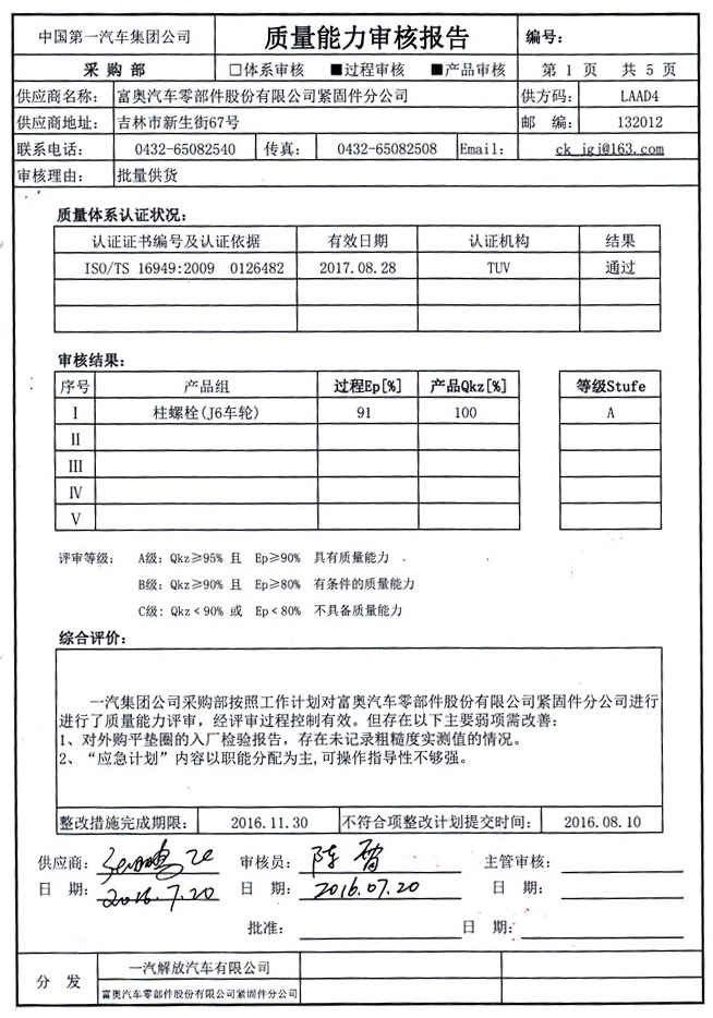 A级供应商审核报告--一汽集团